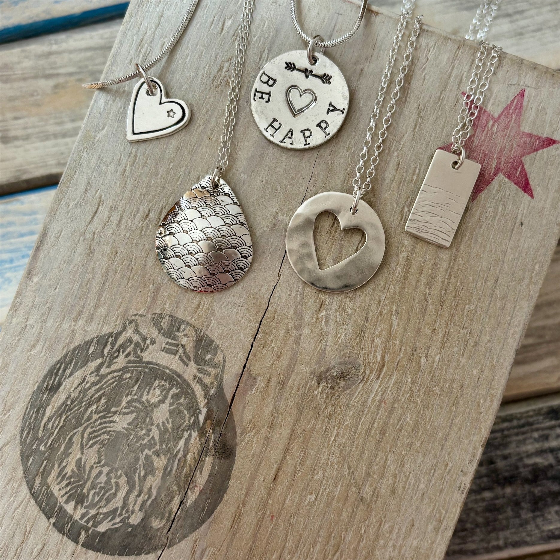 Designing your own Pendant – You start with a slab of 20mm x 1mm thick sterling silver and away you go ! Sketch out a template, then pierce out your desired shape with my trusty saw… Use my stampies or texture plates to create your design ! Wherever your imagination takes you ! Smooth it, shape it and polish it, then drill a small hole for the link ring and add a chain… Maybe make a perfect gift for that someone special !